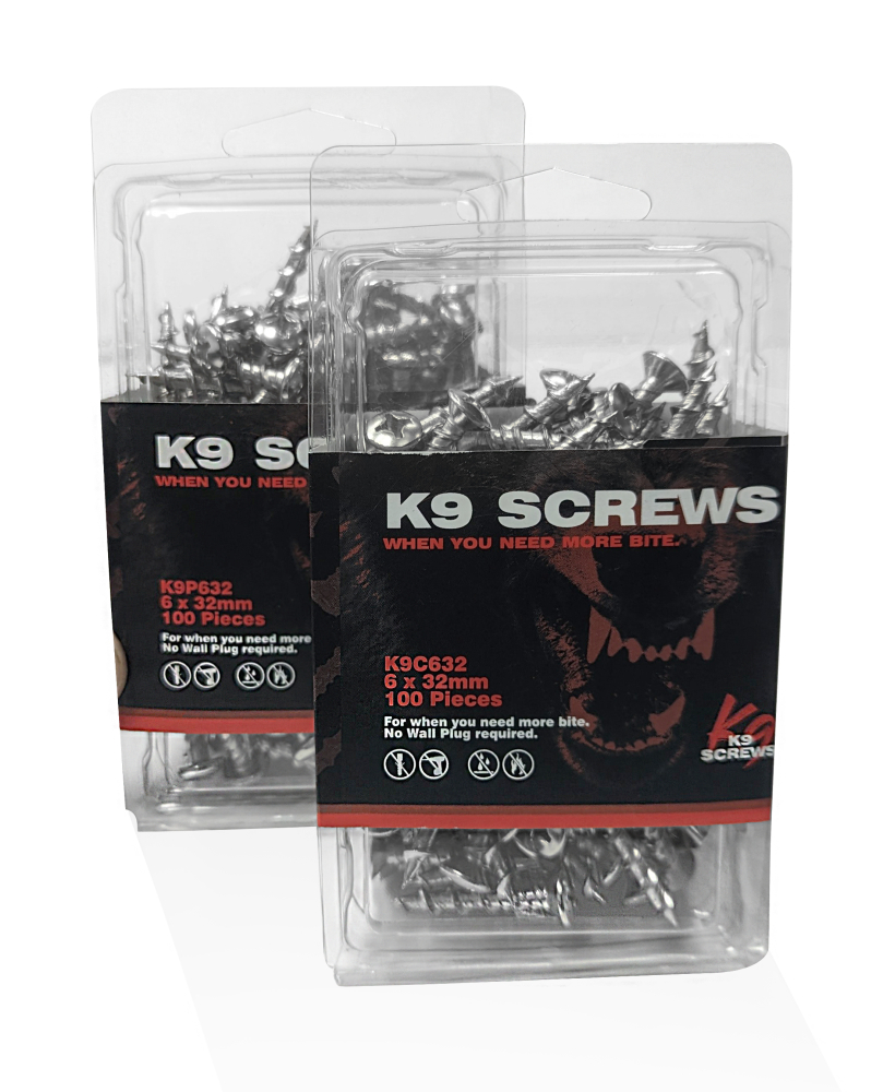 K9SCREWS are the top dog, innovative, plugless masonry screws with exceptional bite, designed for fixing directly into concrete, stone, and masonry. Corrosion and fire-resistant, these self-tapping screws for concrete provide a secure hold without the need for wall plugs. Available in Raised Countersunk Phillips Head (K9C632) and Pan Phillips Head (K9P632), K9SCREWS are perfect for tradespeople seeking reliability and performance. With new branding and packaging, they’re the top choice in fixings and fasteners.