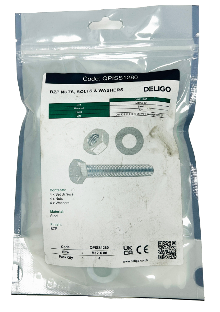 BZP Nuts, Bolts and Washers 12 x 80mm (Pack of 4)