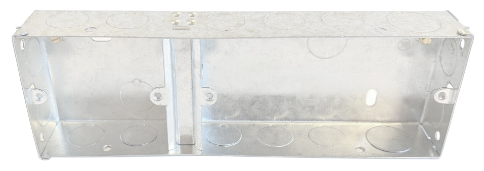 The Multi-Gang Box 25mm 2+1 Gang (Double Plus Single) is a durable steel back box designed to house a combination of two-gang and single-gang accessories. Manufactured from pre-coated bright galvanised steel, it complies with BS4662 standards for safety and reliability. Each box features a regulation brass earth terminal suitable for multiple wires, along with ample cable entries to simplify wiring. For ease of fitting, the design includes at least one adjustable lug, ensuring a secure and professional installation.