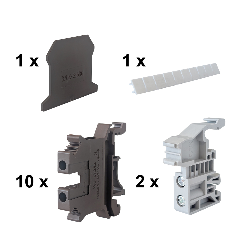 Each DIN-rail terminal kit comprises a tailored selection of screw-clamp terminals in a range of cross-section sizes (2.5 mm up to 25 mm) and colours (grey, brown, blue), along with earth terminals where required, plus the essential end stops, an end plate and blank markers for clear labelling—all in one convenient pack.